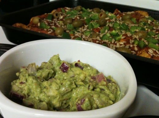 Spread the chips onto a baking dish. Mix the beans and tomatoes together and spoon over the chips – try and make it a fairly even spread. Top with the olives, green pepper, sunflower seeds and spices. Bake for about 5-10 minutes until nice and hot. Serve with your freshly made Guac to knock your socks off! Normally I’d have fresh coriander/cilantro or parsley with this but our garden’s not quite ready yet…