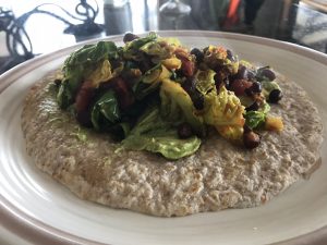 On the weekends, I often whip up a Powergirl fry-up. Usually it’s a mix of garlic, veggies and some sort of bean (refried beans or a tin of chickpeas or black beans). Throw in some spice, sea salt and cracked pepper and serve on a wholemeal tortilla or wrap. Just use whatever you have on hand and get creative! I made one recently that was excellent. It was going to be a simple avocado wrap but evolved into a gourmet delight: